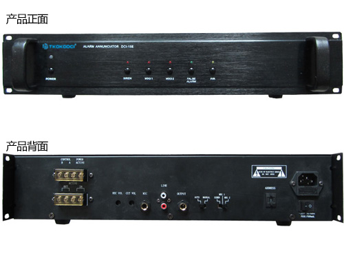 電源開關鍵一個,手動報警鍵三個(SIREN、MSG1和MSG2),結束報警提示音鍵一個,錄音/播放模式選擇鍵一個 ,輸出音量調節一個,錄音電平調節一個,自動報警信號選擇開關一個、結束報警提示音自動/手動播放選擇開關一個,聯機控制接口1個,短路電源激活口一個設備地址設置開關一個(1位)